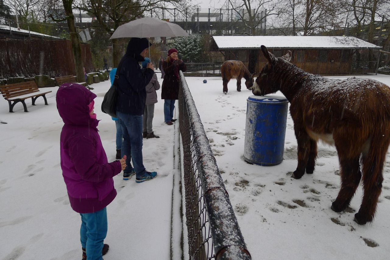 To get some fresh air we took a ten minute bike ride to the Heidelberg zoo and even though we had checked the weather before leaving we were surprised by a sudden heavy icy downpour that was not quite snow.